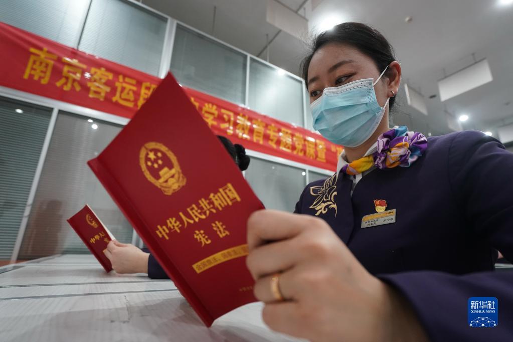 12月3日,乘务员在活动上学习宪法知识。 当日,南京铁路公安处乘警支队民警来到中国铁路上海局集团有限公司南京客运段,开展宪法宣传活动,迎接国家宪法日的到来。 新华社记者…